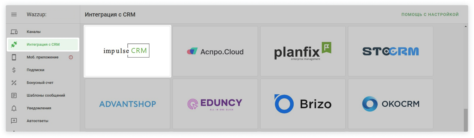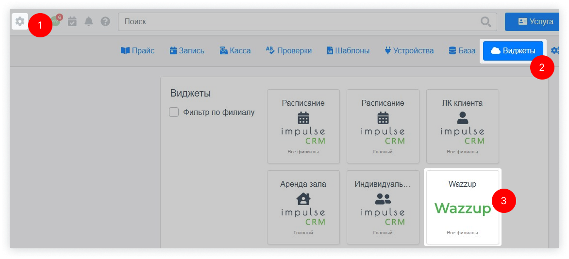 12. Вернитесь в impulseCRM → в левом верхнем углу кликните на шестеренку → откройте раздел «Виджеты» → дважды кликните на виджет Wazzup.