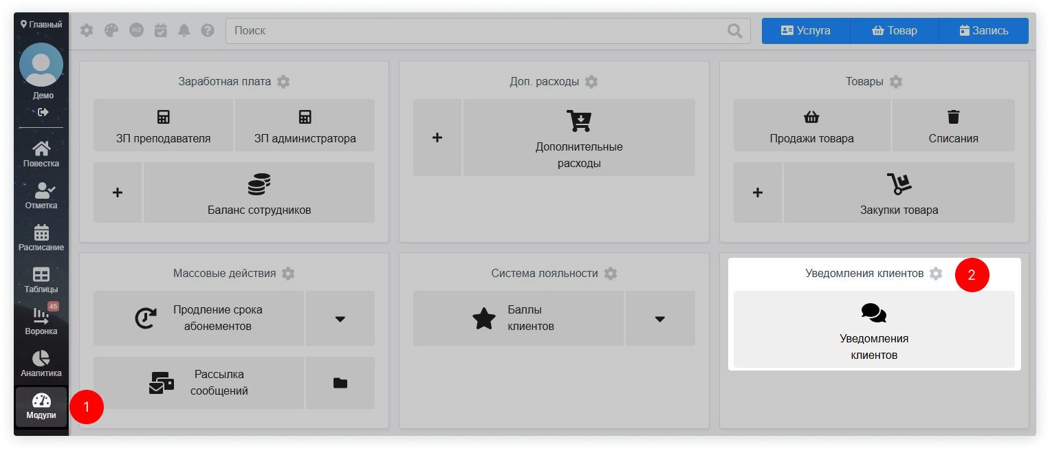 6. Чтобы подключить уведомления клиентам перейдите в раздел «Модули» → выберите «Уведомления клиентов».