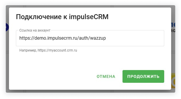 5. Откроется окно impulseCRM с настройкой интеграции и нажмите «Продолжить».
