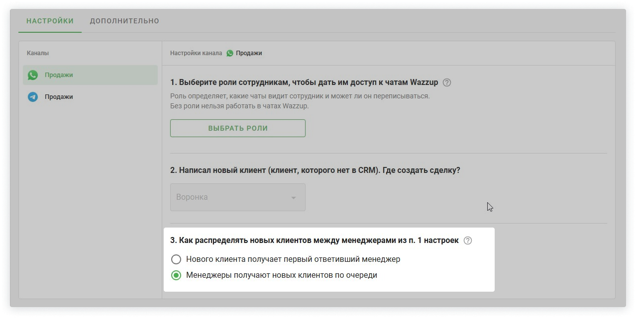 10. В третьем пункте для каждого канала настройте распределение новых клиентов и нажмите «Сохранить».