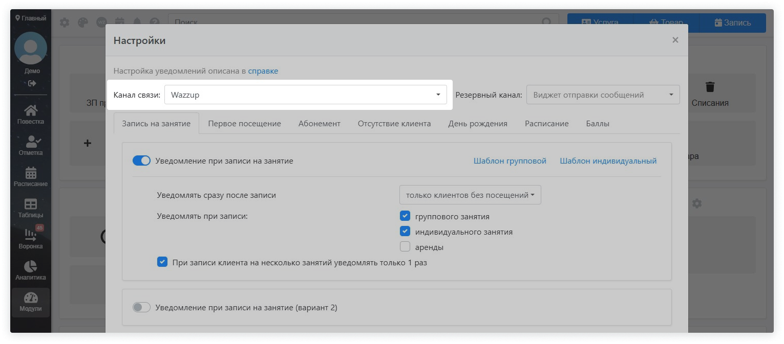 Автоуведомления и массовые рассылки работают только с WhatsApp и WhatsApp Business API. Если используете другие каналы — эти функции будут недоступны.