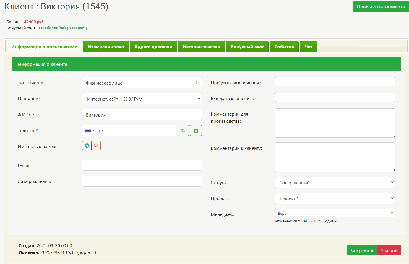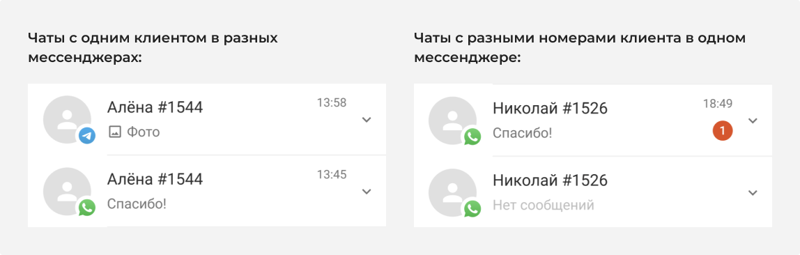 Если сотрудник общался с клиентом в разных мессенджерах, то переписка на каждом канале будет отображаться отдельно. Если у клиента несколько номеров телефона в одном мессенджере, то чат с каждым номером будет отображаться как отдельный. При этом имя клиента и его id будут одинаковыми.