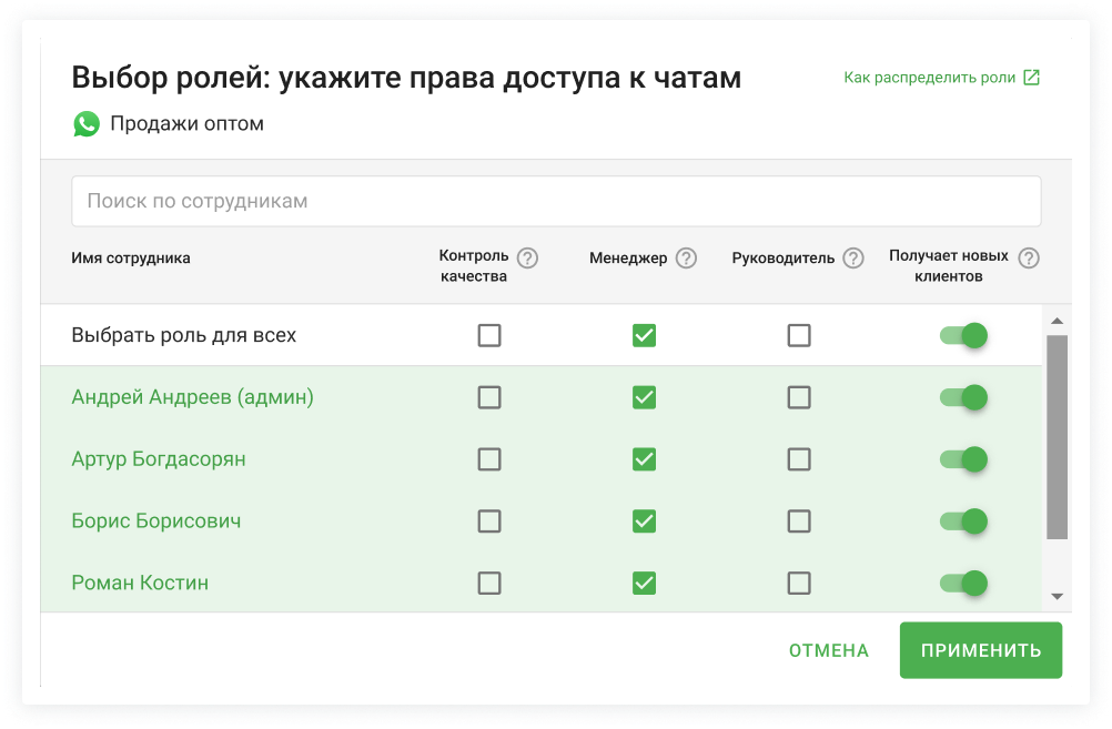Когда выберете роли, нажмите кнопку «Применить». Если подключено несколько каналов, настройте роли пользователей на каждом.