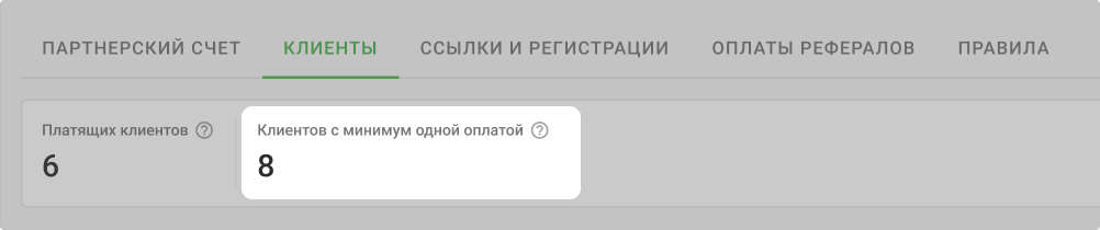 Во вкладке «Клиенты» показываем, сколько ваших клиентов оплатили сервис хотя бы один раз: самостоятельно или через вас. Если таких клиентов 10, увеличиваем до 50% вознаграждение с оплат, которые проводите через свой кабинет.