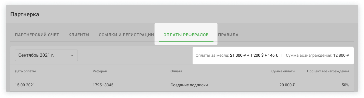 На вкладке «Оплата рефералов» в правом верхнем углу — ваш заработок. Мы считаем его по простой формуле: оплата * ваш процент вознаграждения. Всё честно, прозрачно и всегда под рукой.