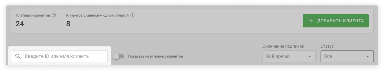 Воспользуйтесь строкой поиска, чтобы найти клиента по ID или имени. Поиск работает по всей таблице.