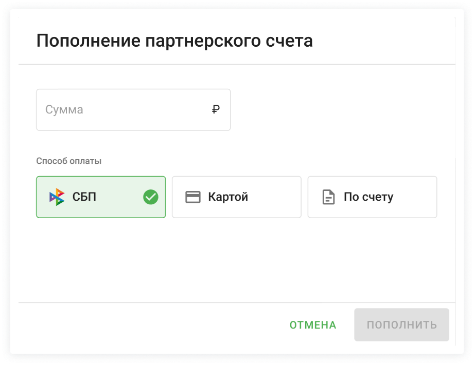 3. Выберите способ оплаты: через СБП, банковской картой или по безналу → пополните счет.