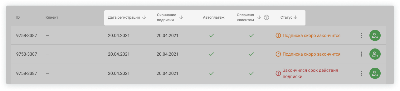 В таблице есть колонка Статус — в ней отображаются текущие проблемы с подпиской или каналами клиента. Вы можете отфильтровать клиентов по этим статусам, чтобы быстрее найти нужных.