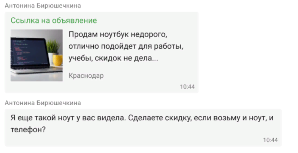 Если клиент отправил вам в личные сообщения объявление и задал по нему вопрос, это будет выглядеть так: