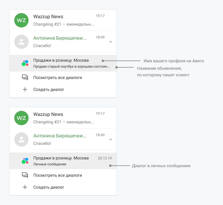 На каналах Avito есть два вида чатов — чат по объявлению и чат в личных сообщениях.