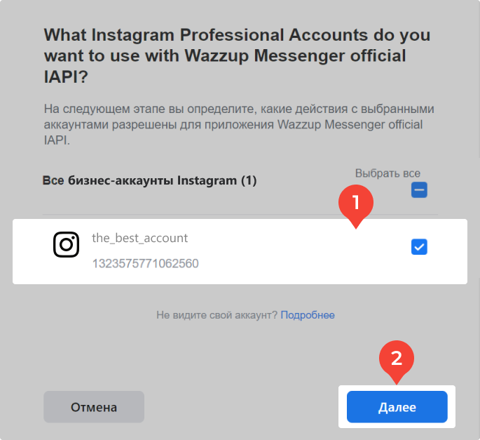 5. Выберите бизнес-аккаунт Instagram, для которого добавляете канал → «Далее». Можно выбрать сразу несколько аккаунтов.