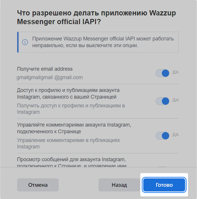 7. Оставьте включенными все ползунки. Если что-то отключить и не дать какие-то права приложению Wazzup Messenger Official API — канал будет работать некорректно.