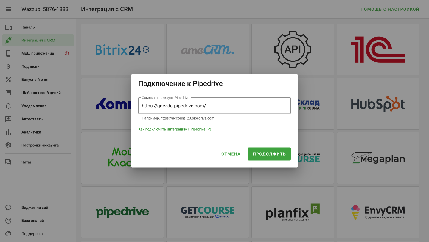 1. Перейдите в раздел «Интеграция с CRM» в личном кабинете Wazzup. Выберите Pipedrive.