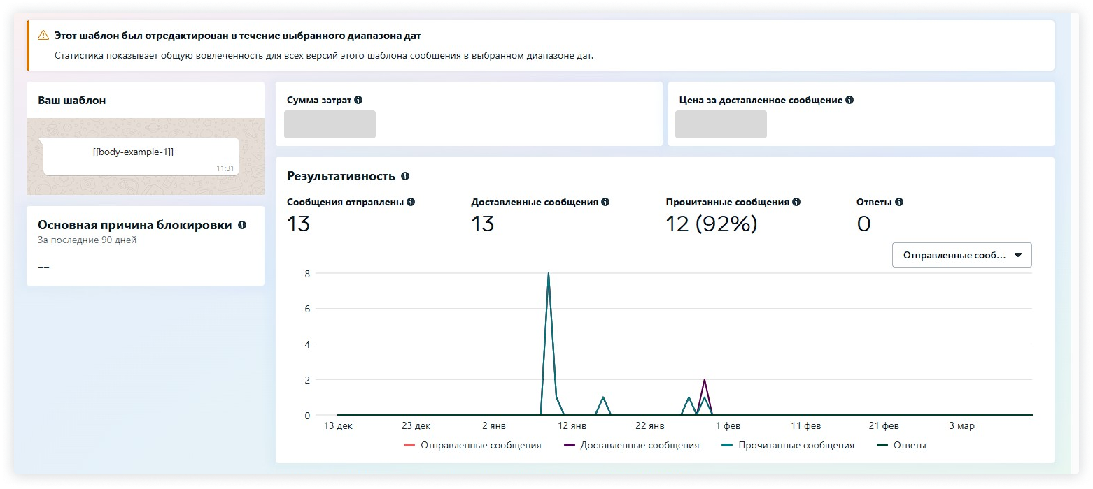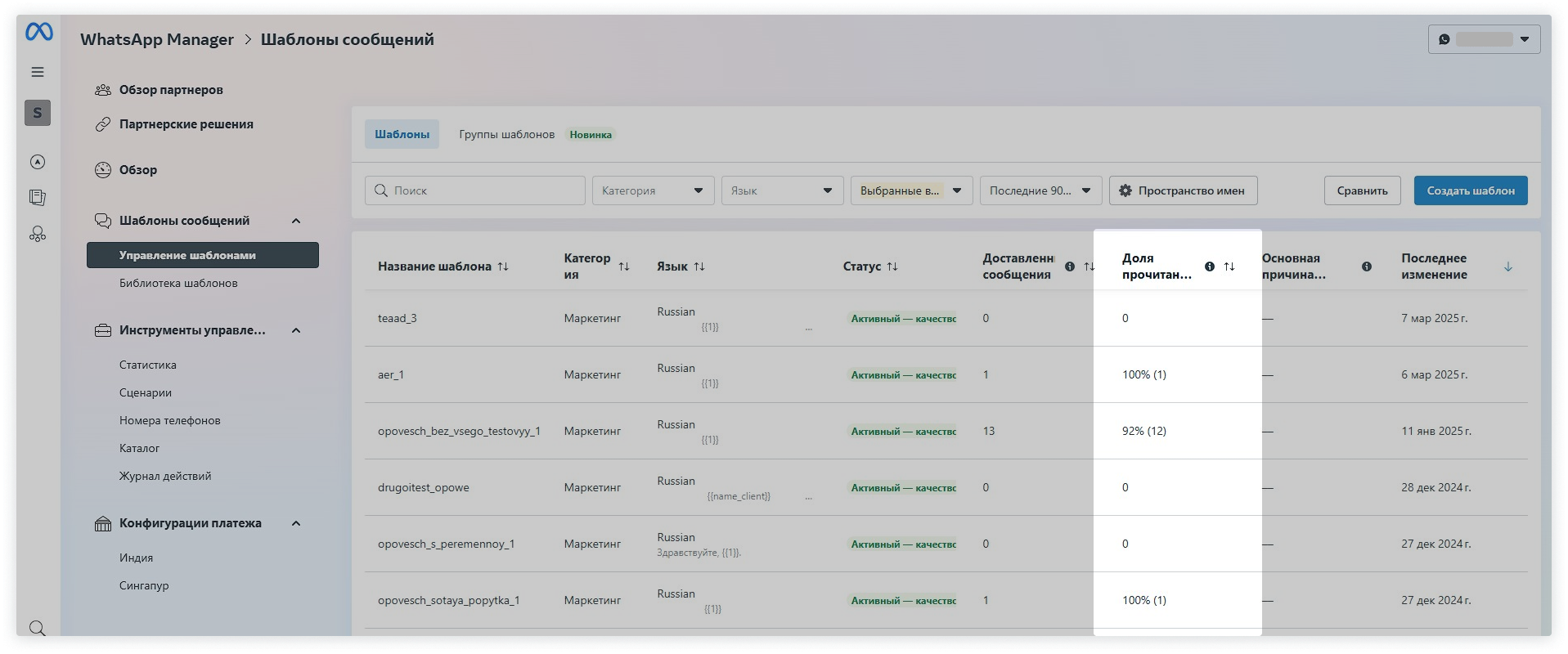 С апреля 2024 года Meta ввела новый показатель — коэффициент прочтения (Read Rate). Он помогает оценивать качество маркетинговых шаблонов в WhatsApp Business API (WABA). Если процент прочтений низкий, Meta может поставить шаблон на паузу или даже заблокировать его, чтобы защитить пользователей от спама.