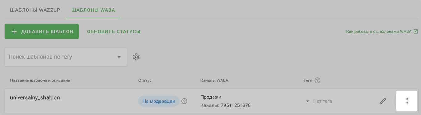 Даже если не планируете использовать универсальные шаблоны, предлагаем оставить. Чтобы они не мешали в личном кабинете и продавцам в чате, перенесите их вниз в списке шаблонов WABA по кнопке