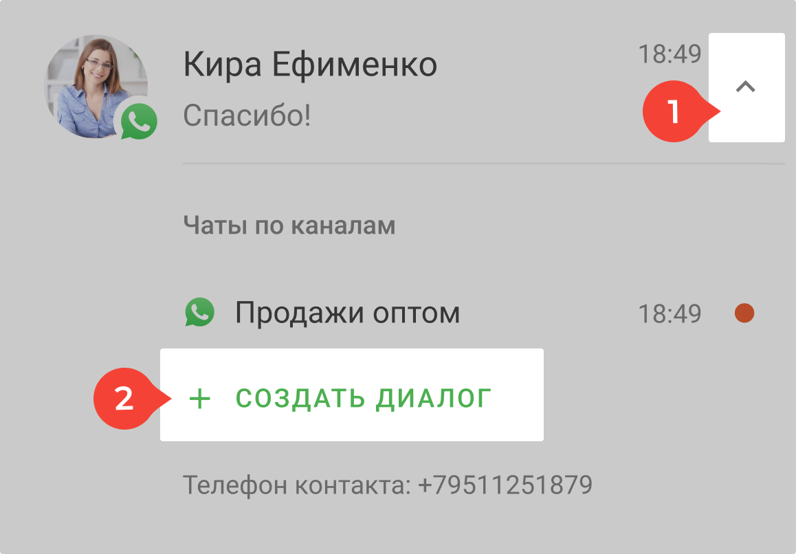 Если нужно написать с другого номера: нажмите на стрелку рядом с именем контакта в списке чатов → создайте чат с нужного номера по кнопке «+ Создать диалог».