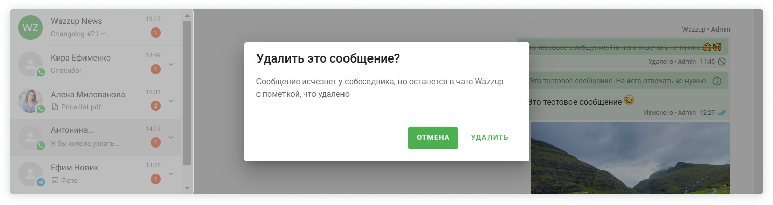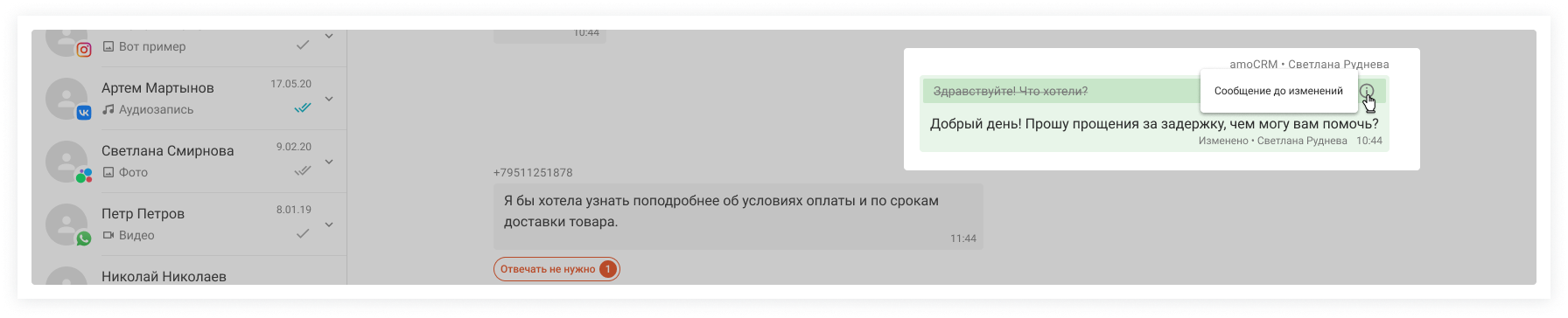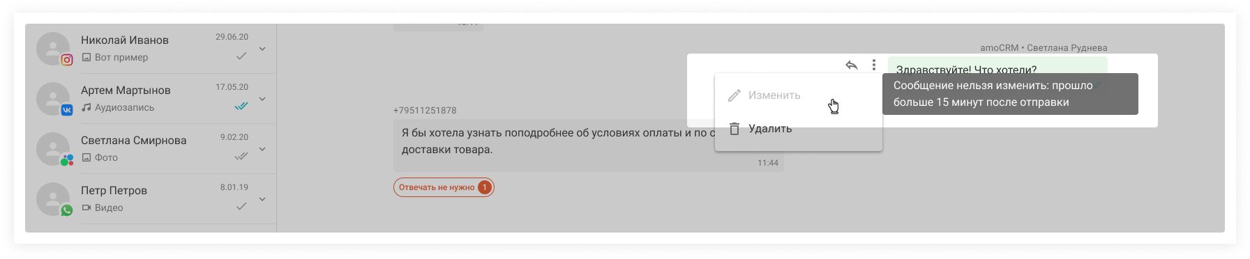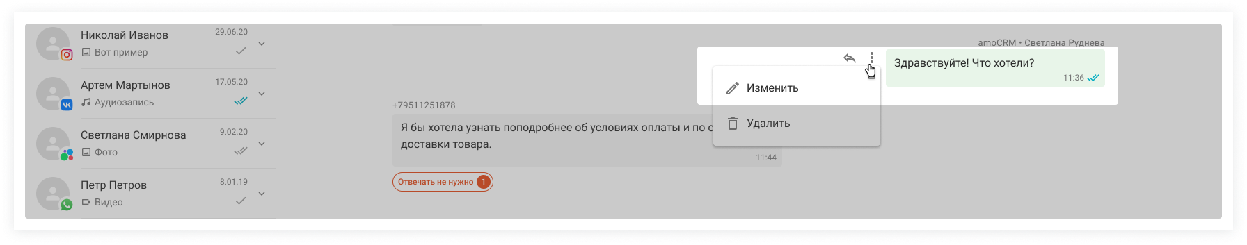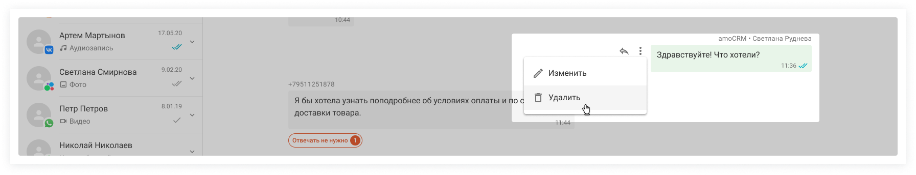 Как и в мессенджерах, в Wazzup доступно редактирование и удаление сообщений, поэтому продавец сможет быстро исправить опечатку или удалить случайно отправленное.