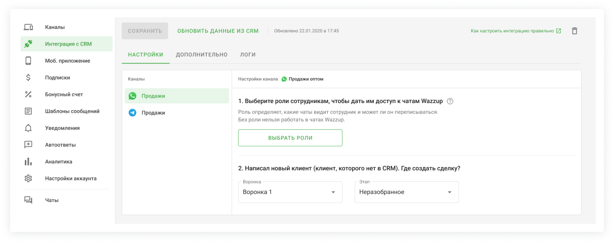 Настройки отображаются во вкладке «Интеграция с CRM» после подключения интеграции. Если у вас подключено несколько каналов, интеграцию для каждого канала нужно настроить отдельно.