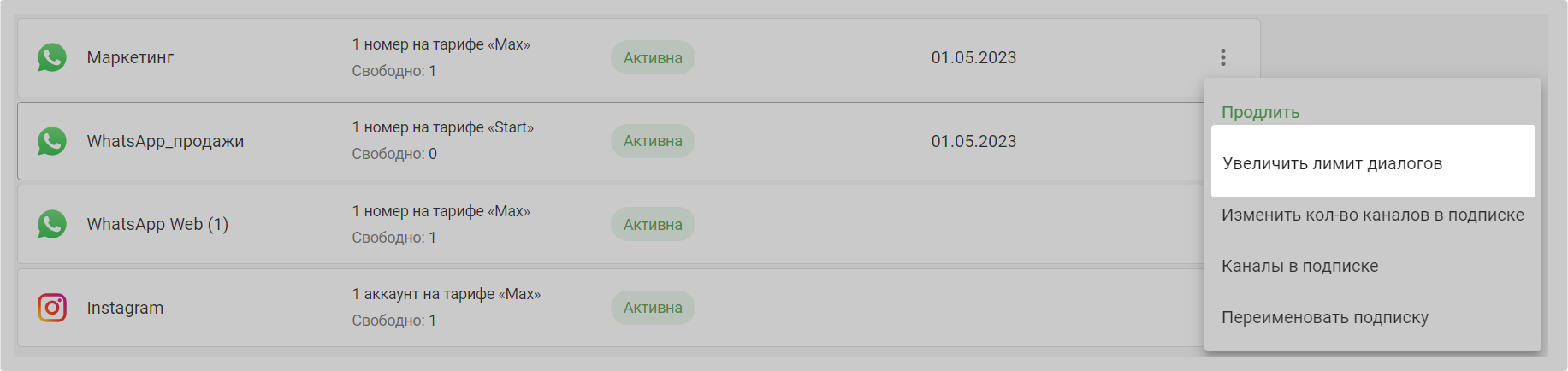 2. Нажмите иконку ⋮ справа от подписки и выберите «Увеличить лимит диалогов».