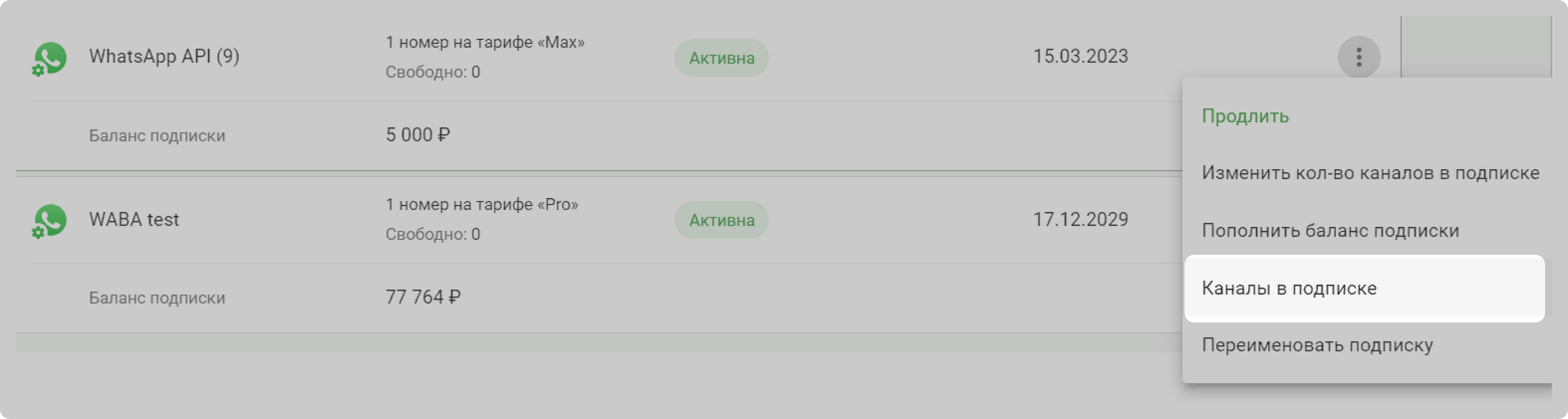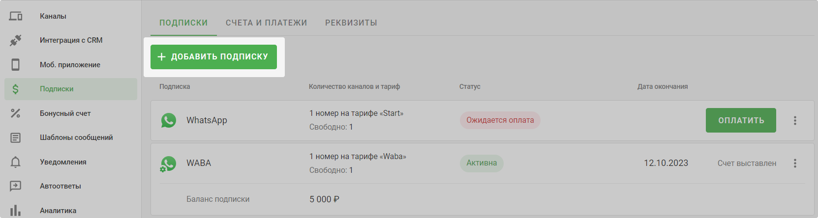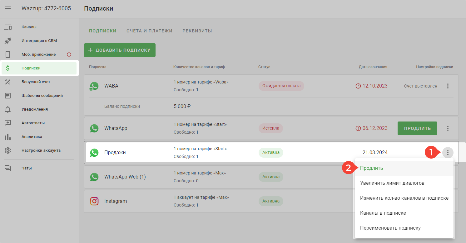 1. Перейдите в раздел «Подписки» в личном кабинете Wazzup.