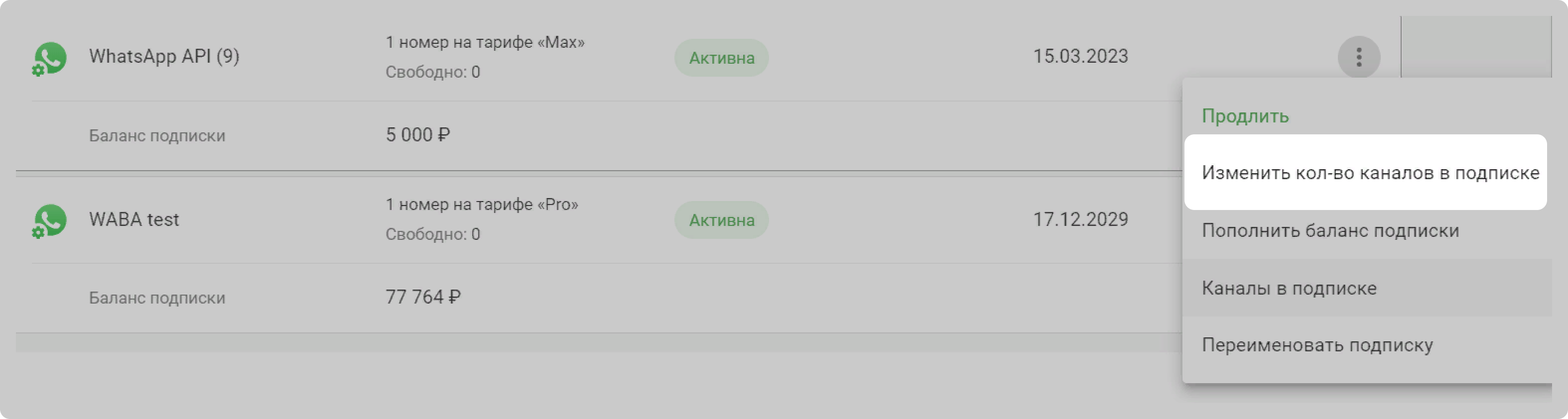 2. Нажмите иконку ⋮ справа от подписки и выберите «Изменить кол-во каналов в подписке».