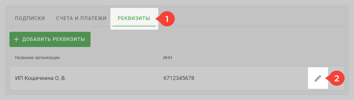 Второй способ: поменять данные во вкладке «Реквизиты». Для этого тоже нажмите на карандаш справа от нужной организации.