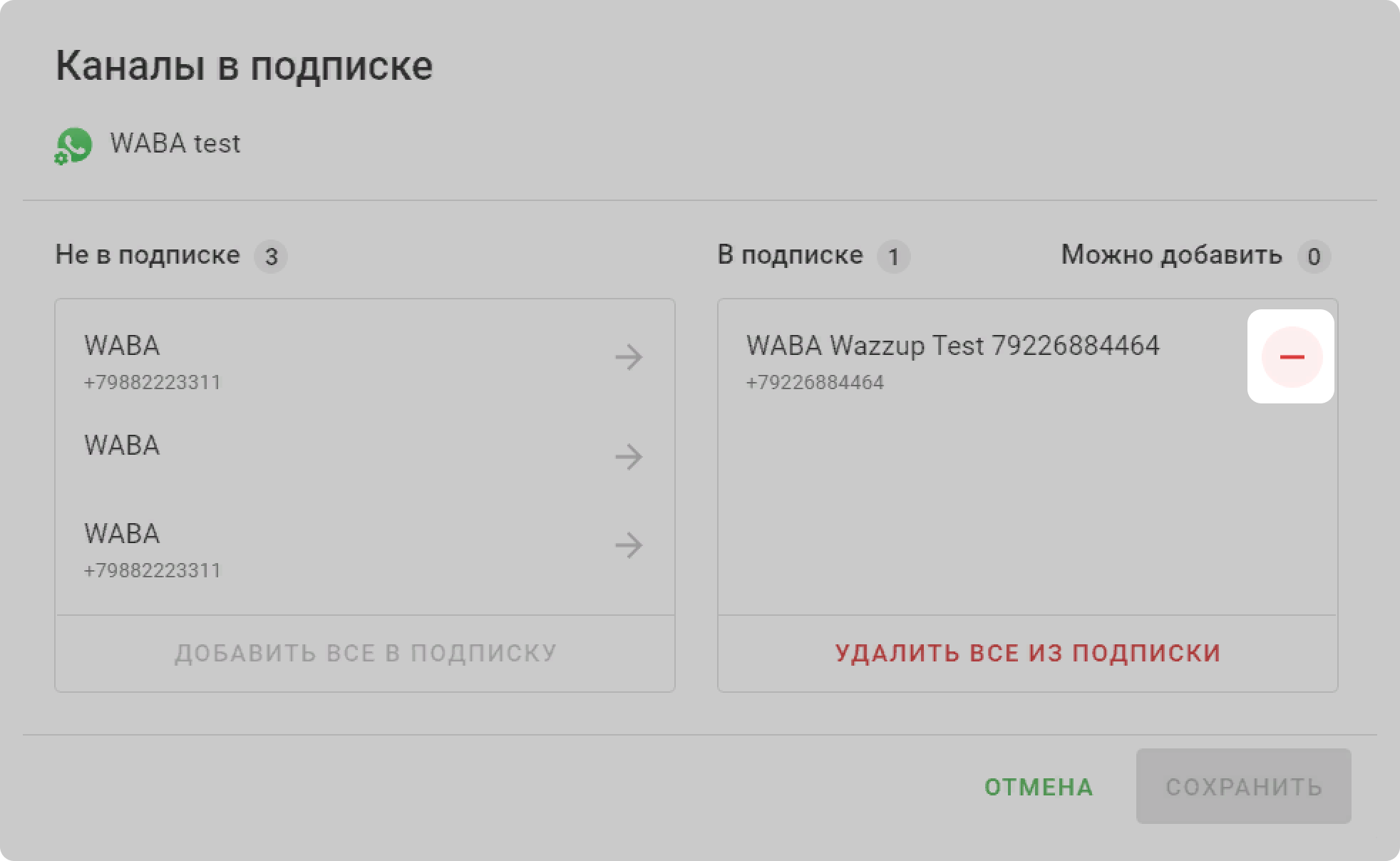 Каналы добавятся в подписку автоматически после оплаты. Например, если у вас в аккаунте 2 канала WhatsApp и вы добавляете подписку на 1 канал, то Wazzup случайным образом выберет канал и добавит его в подписку.