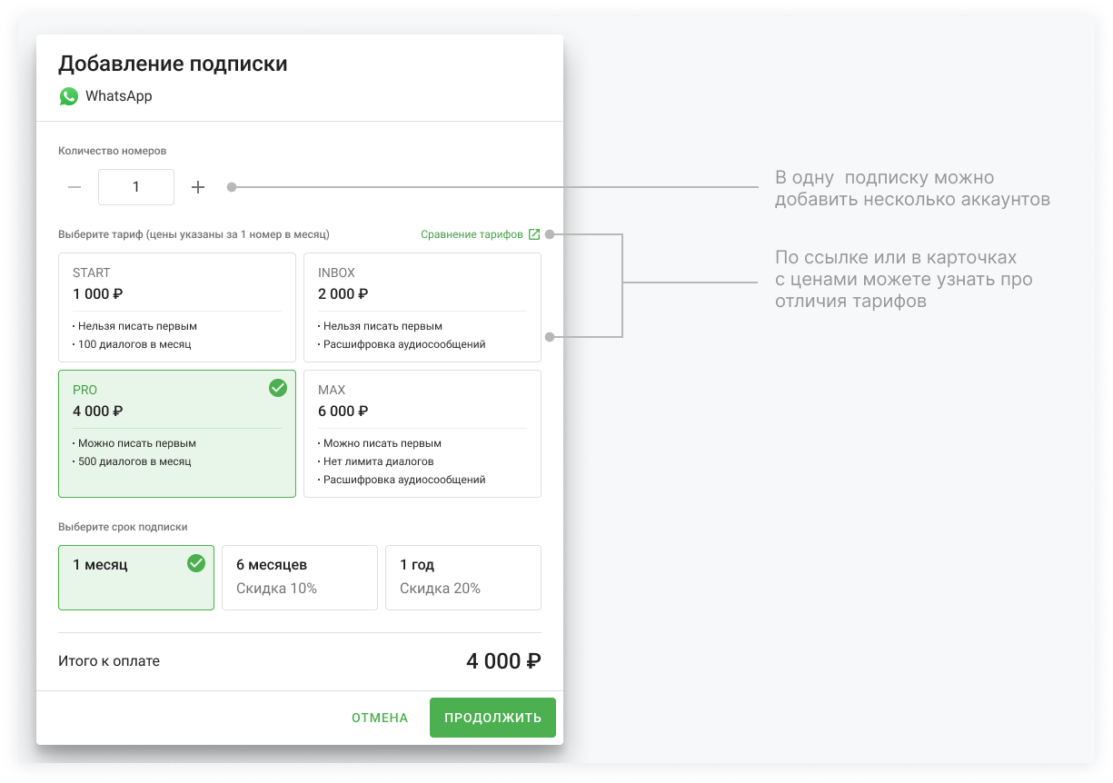 4. Если оформляете подписку для WABA, введите сумму баланса → Продолжить.