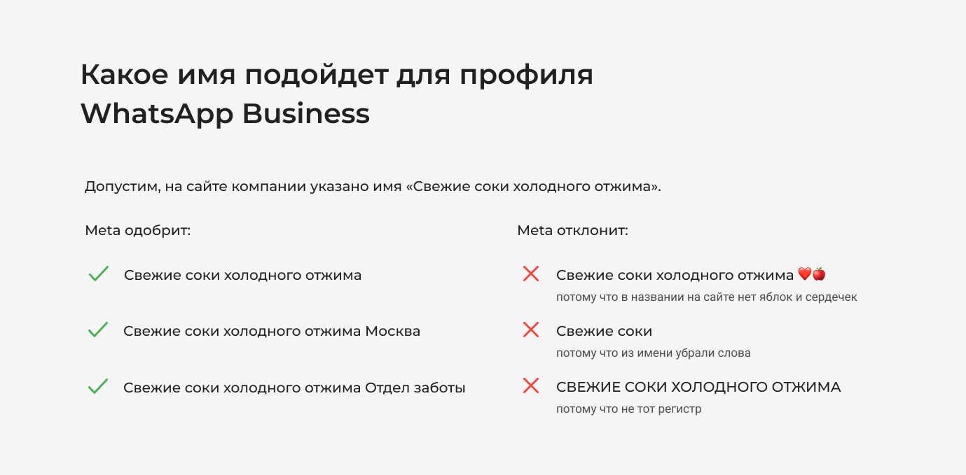 Так бывает, если после верификации Meta не одобрила имя вашего профиля WhatsApp Business. Его указывали, когда подключали канал WABA.
