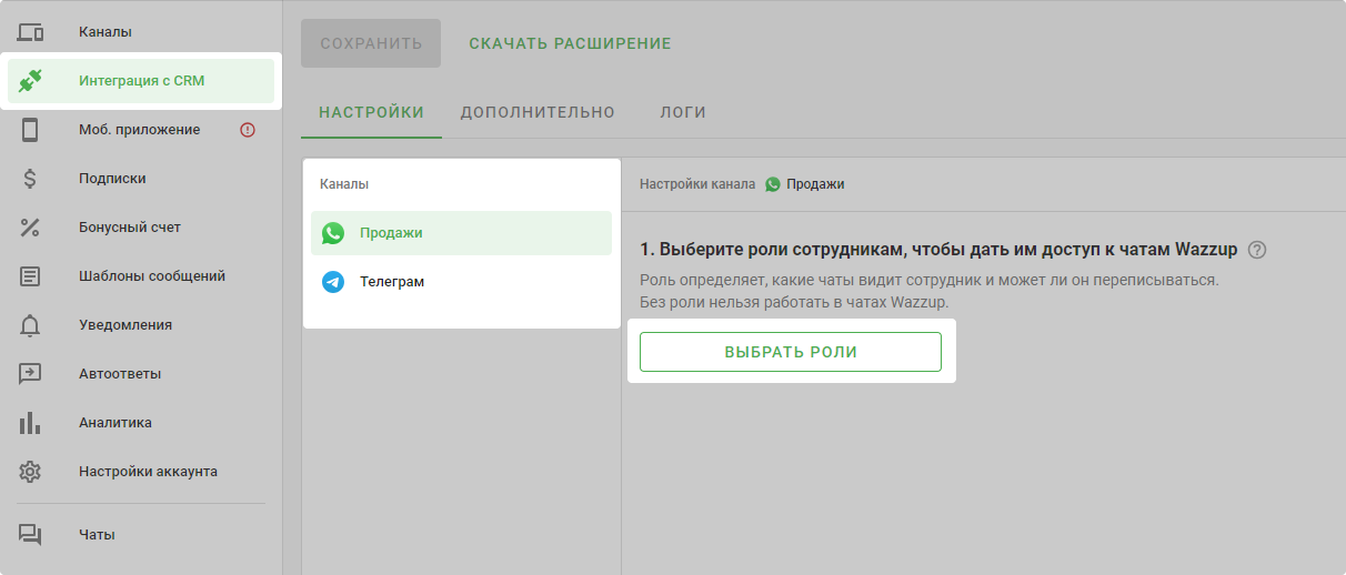 1. Перейдите в раздел «Интеграция с CRM» → «Выбрать роли». Откроется модальное окно со списком сотрудников. Там же вы найдете подсказки, как распределить роли и что они означают. Если у вас несколько каналов, выберите сотрудникам роли на каждом из них.