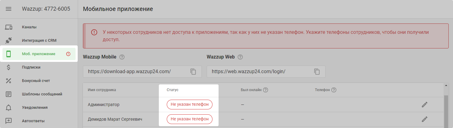 2. Перейдите в раздел «Мобильное приложение». Вы увидите список всех сотрудников. У сотрудников со статусом «Не указан телефон» пока нет доступа к приложениям Wazzup, именно они нас интересуют.