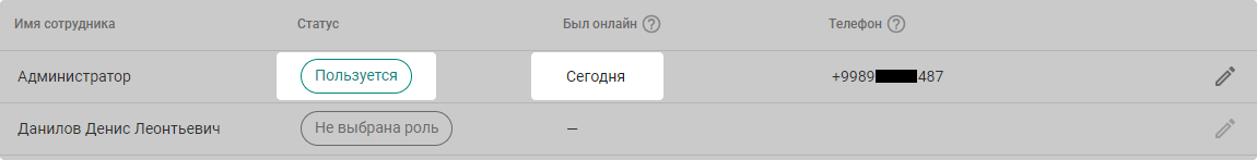 5. Когда сотрудник зайдет в мобильное приложение, Wazzup Web или приложение для ПК, статус сотрудника поменяется на «Пользуется». Правее в колонке «Был онлайн» появится дата последнего входа.