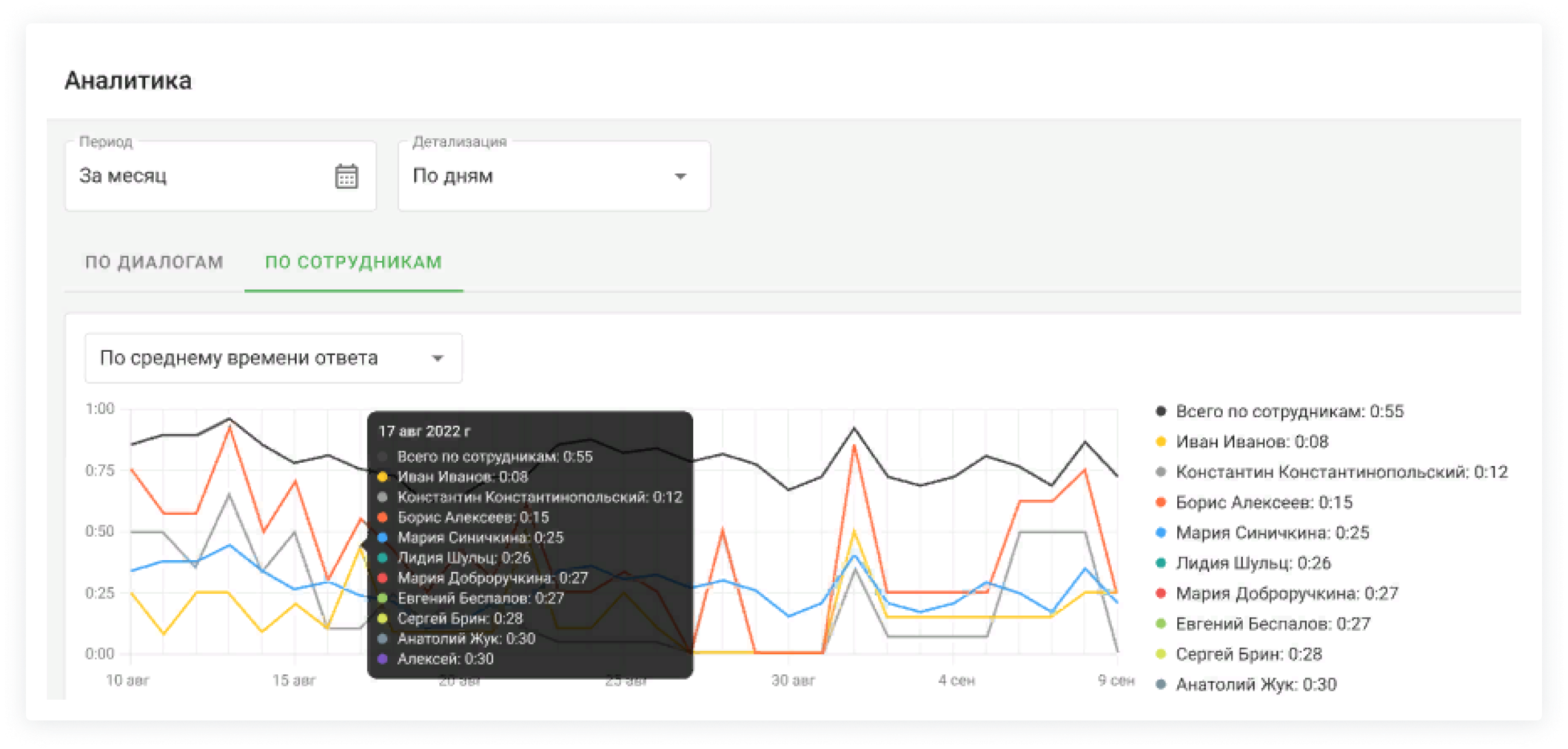 Перейдите на вкладку «По сотрудникам» → откройте график «По среднему времени ответа».