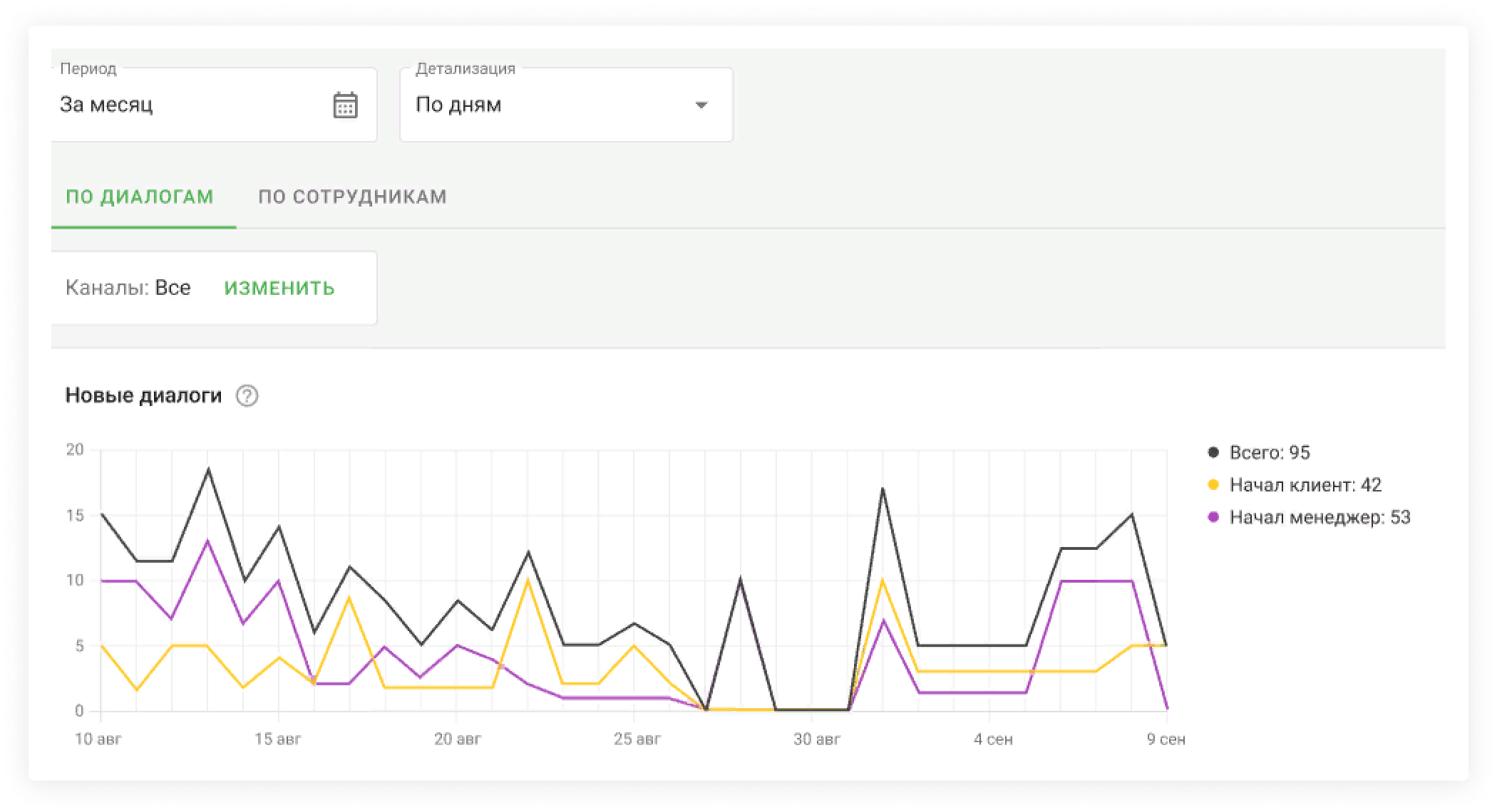 Посмотреть статистику по каналам можно только во вкладке «По диалогам». Для этого нажмите на кнопку «Изменить» на панели «Каналы» и укажите нужные.
