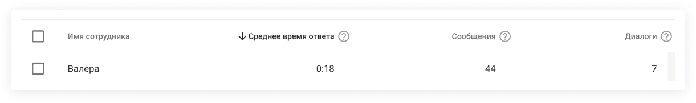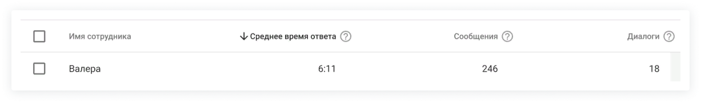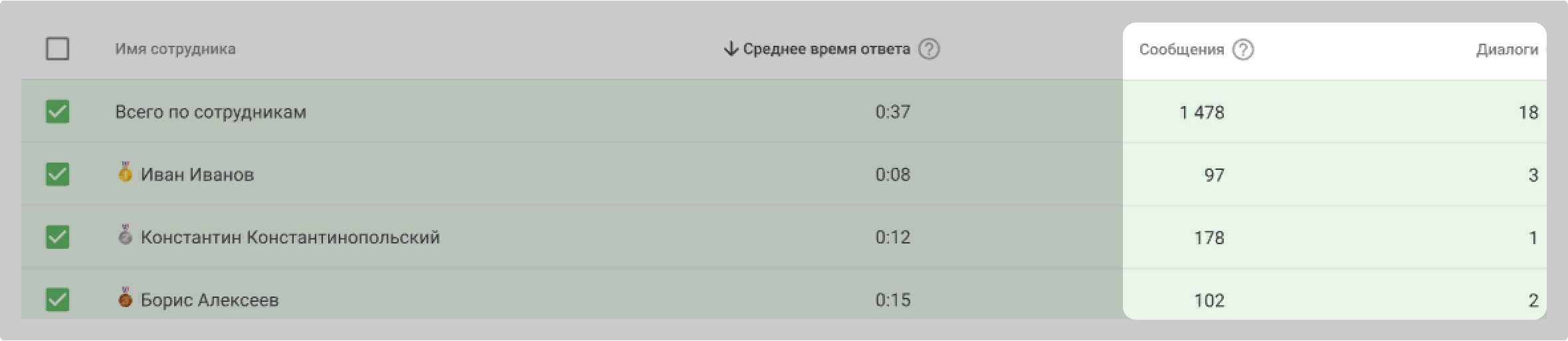 Если среднее время продавца выросло или упало, можно узнать причину: для этого посмотрите на число отправленных сообщений и диалогов у сотрудника.