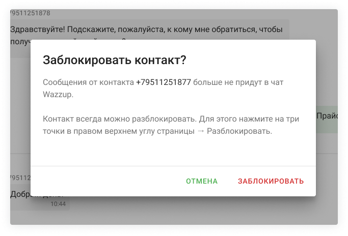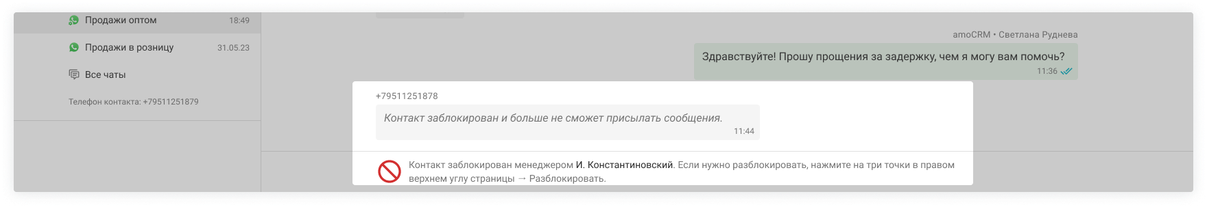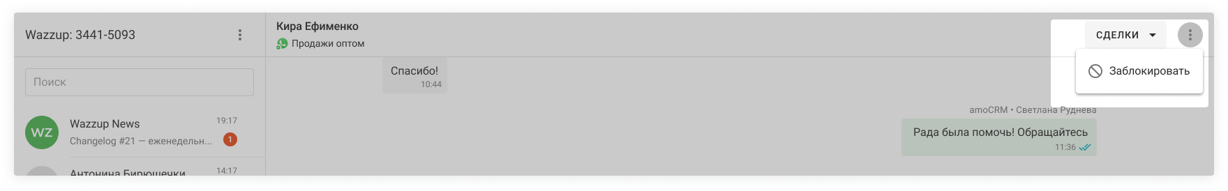 Чёрный список помогает блокировать и разблокировать контакты с личных чатов Wazzup. Это удобно, если вы хотите ограничить нежелательные общения.