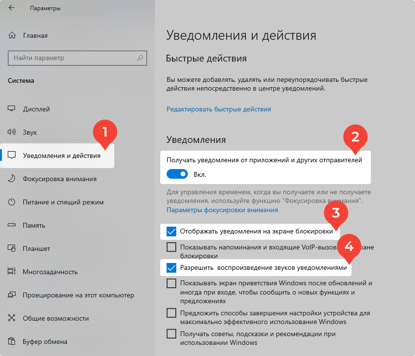 Поставьте галочки в пунктах «Отображать уведомления на экране блокировки» и «Разрешить воспроизведение звуков уведомлениями».