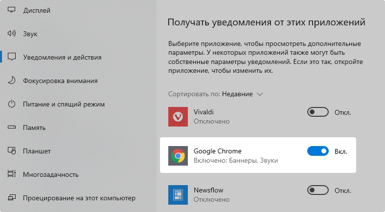 Промотайте страницу ниже и убедитесь, что в разделе «Получать уведомления от этих приложений» включен показ уведомлений для браузера Google Chrome.