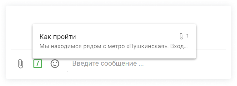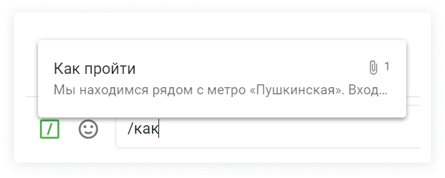 Способ №2. В поле для текста введите слеш — «/». Он вызовет список шаблонов. Чтобы быстро найти шаблон в списке, начните вводить его название после «/». В списке отобразятся только подходящие варианты. Если используете второй способ, выбрать нужный шаблон можно не только наведением курсора, но и с помощью стрелок на клавиатуре.
