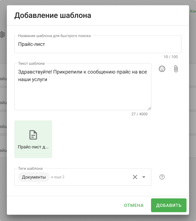 С помощью теги можно группировать шаблоны. Например, все шаблоны про оплату отметить одним тегом, про доставку — другим. Так сотрудники смогут фильтровать шаблоны по тегам в чатах Wazzup.